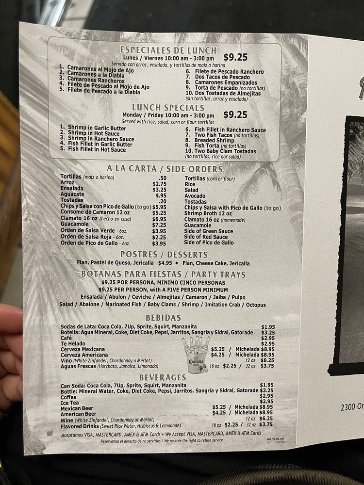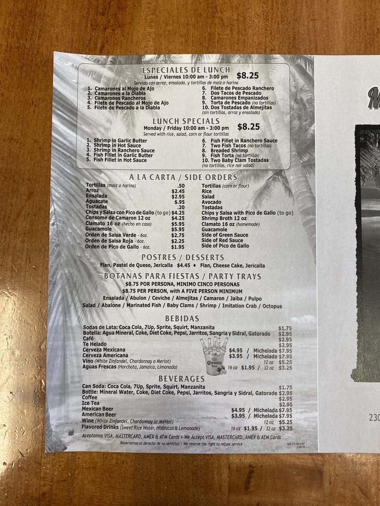 Mariscos Clemente, a Mexican seafood restaurant located in Fullerton, CA, offers a diverse menu with many vegetarian options. Customers rave about the generous portions, fresh ingredients, and friendly service. The camarones a la diabla and shrimp cocktail are particularly popular choices. The micheladas and fresh waters are highlighted for their delicious flavors. The restaurant's atmosphere is clean and inviting, making it a great spot for lunch or dinner. With a variety of amenities such as outdoor seating, catering, and Wi-Fi, Mariscos Clemente caters to a wide range of preferences. Overall, the food is praised for its fresh and flavorful taste, appealing to both seafood enthusiasts and those seeking a satisfying dining experience.